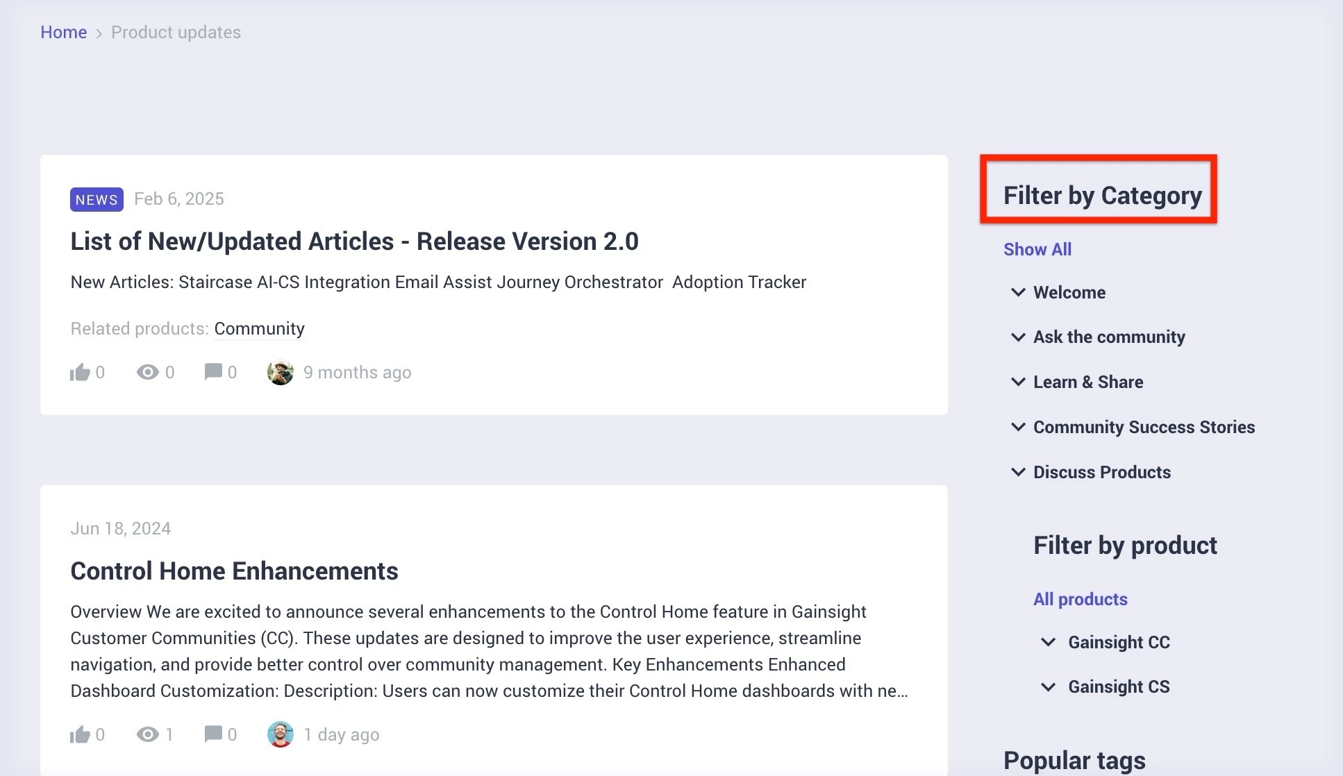 Users can filter Product Updates by category to view all updates associated with a specific topic.