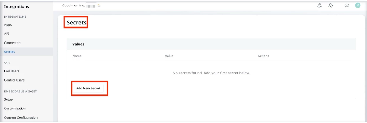 - Click Add New Secret, give it a name, and securely store your API key or token