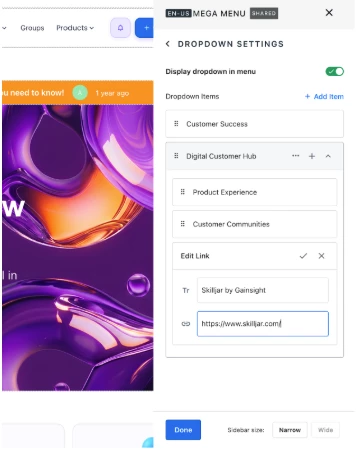 Admins and Community Managers can now add dropdown lists under custom navigation items in the Mega Menu.