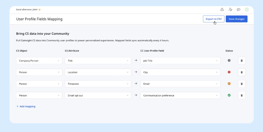 Gainsight CC admins can now map Gainsight CS attributes directly to CC user profile fields and keep them in sync automatically.