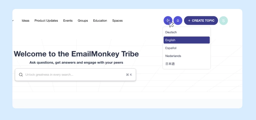 Redesigned language switcher in the community header is marked by a new globe icon lets members select their preferred language instantly. The selection applies immediately across all system-generated content: interface text, metadata, and standard phrases.