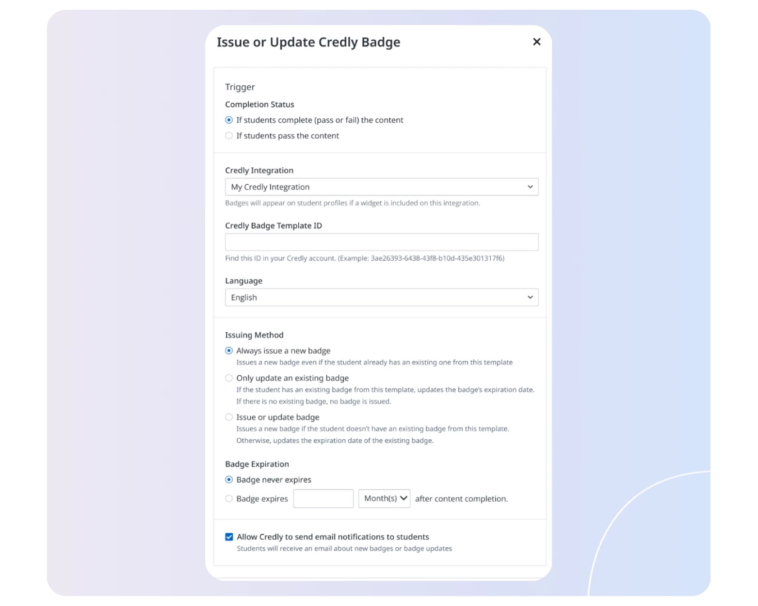 From the Actions tab, you can configure Credly badges to be triggered with flexible options based on whether a learner passes or completes the course. You’ll be able to control how and when badges are issued, whether that’s issuing new badges, updating existing ones, or setting expiration timelines.