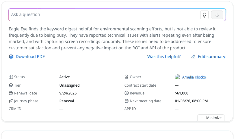 - Access customer intelligence without switching tools or pulling reports