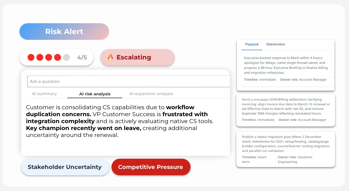 Make it a habit to review accounts as soon as their Risk Level Score moves to Engage, Escalate, or Critical. Risk Analyst analyzes recent customer conversations, identifies root causes across nine risk categories, and generates personalized playbooks based on what worked in similar past scenarios. Acting early turns rising risk into coordinated action — not last-minute renewal surprises.