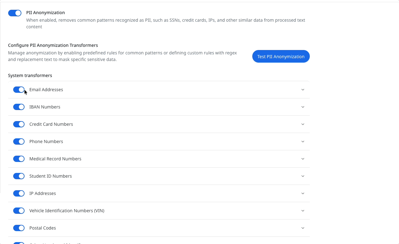 - Toggle built-in anonymization for emails, phone numbers, SSNs, and more