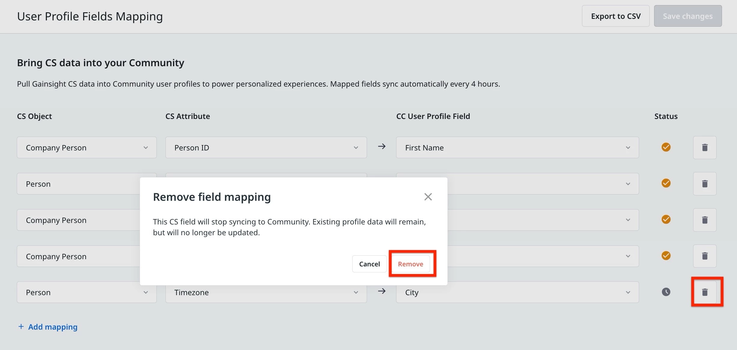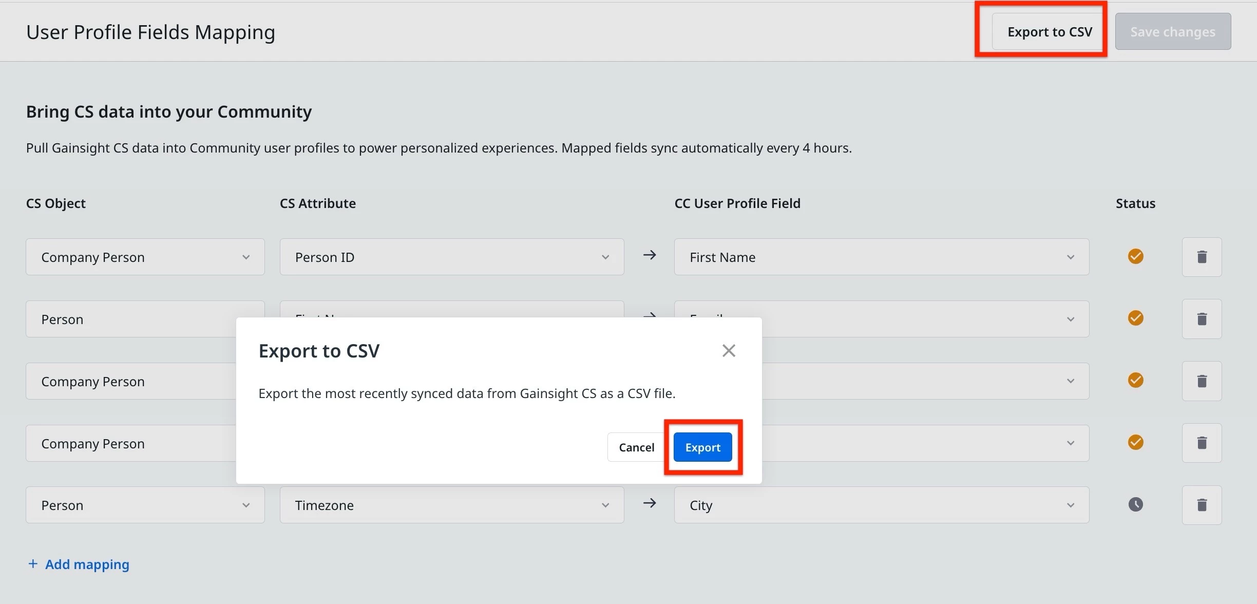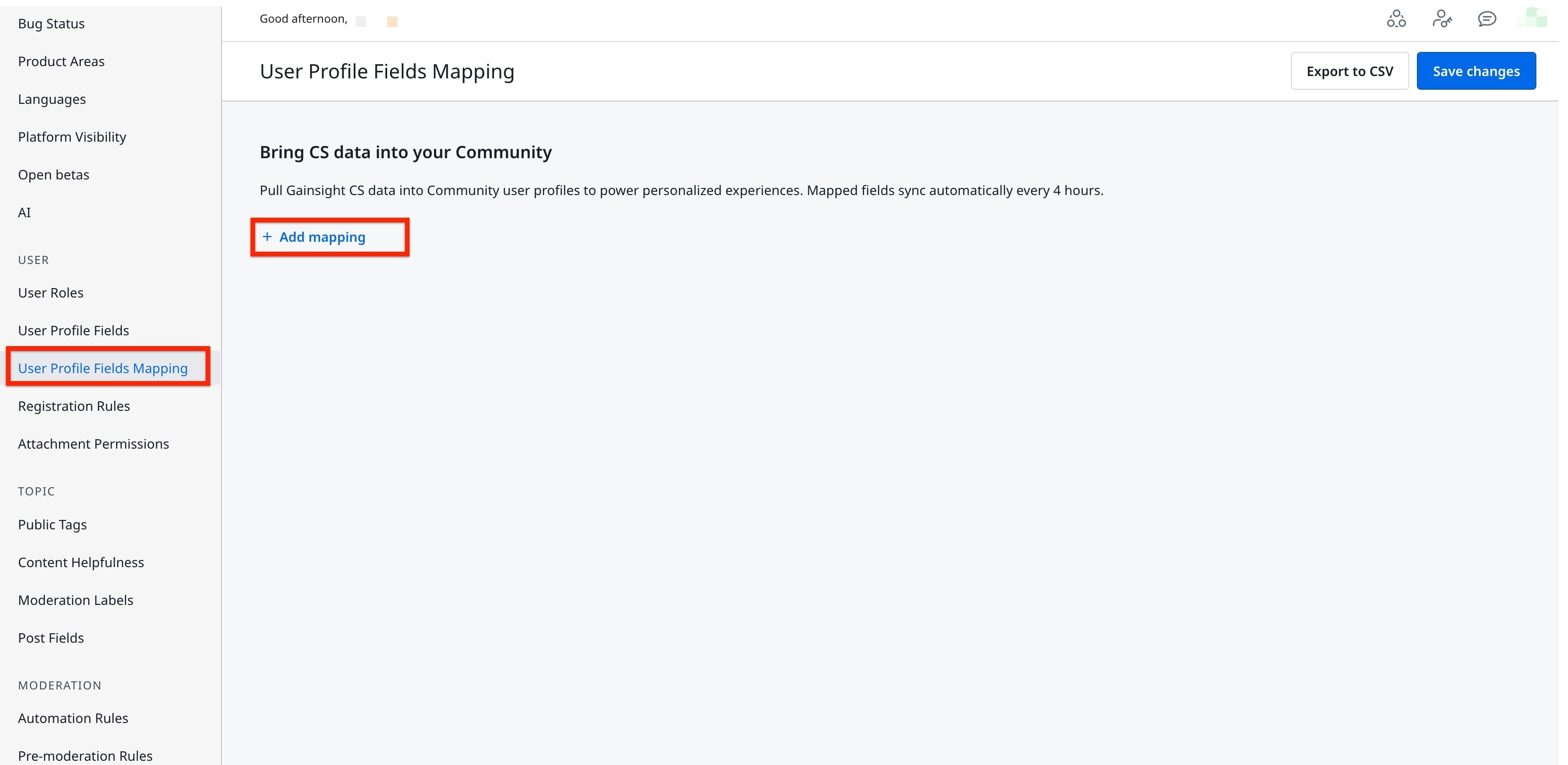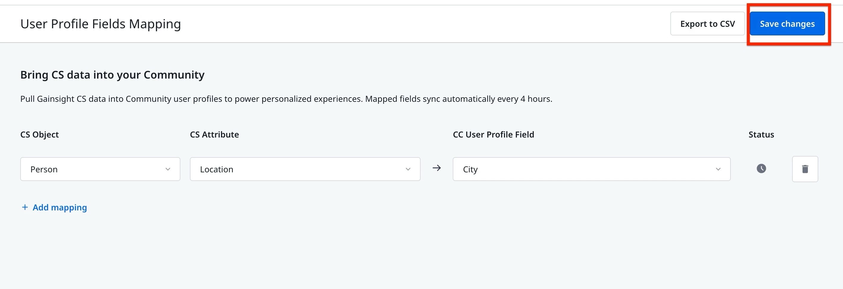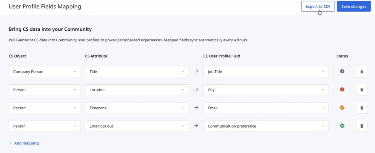 User Profile Field Mapping in Gainsight CC enables admins to define attribute mappings between Gainsight CS standard objects and CC user profile fields. Once you save mappings, a synchronization job on the CS side runs every four hours and populates the mapped CC fields with the corresponding CS attribute values.
