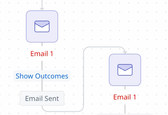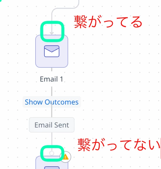 箱(EmailやEvaluate)を線につなげても、以下の画像の下のように接続部が◯になるだけで、実はこの状態では繋がっていません。