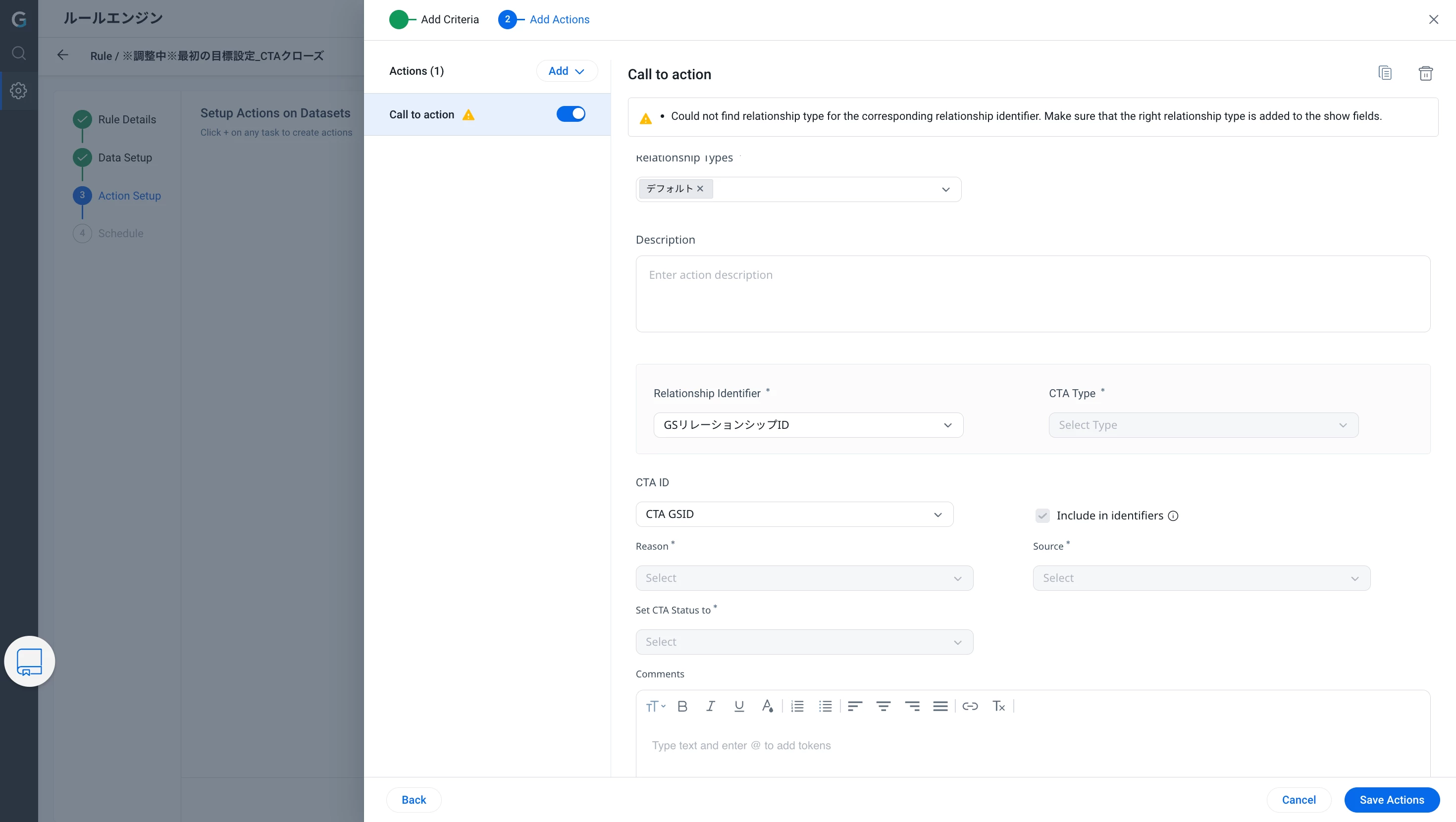 自動でCTAをクローズするルールを作成しているのですが、Actionsを登録しようとすると以下のエラーが表示されます。