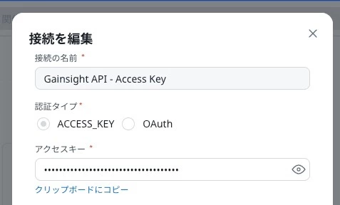 Accesskey 上記2ステップで設定したGainsight APIで発行されているACCESS_KEYの値