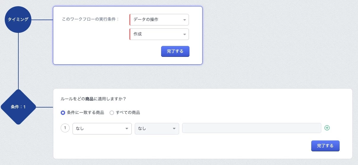 タイミングは「データの操作」の「作成」を選択、条件も設定します。